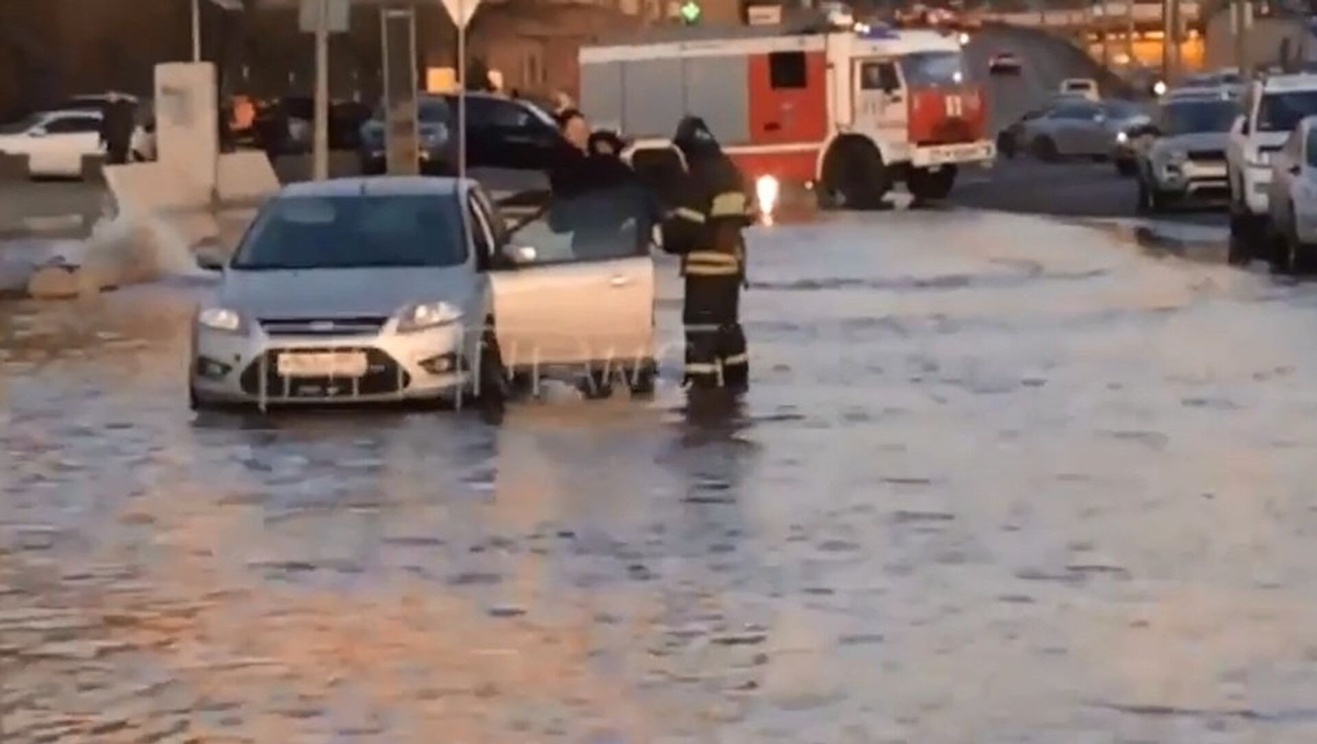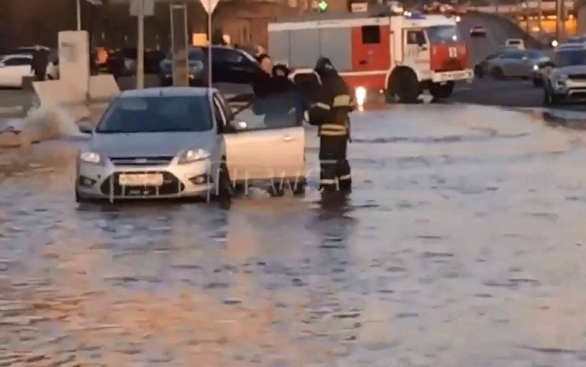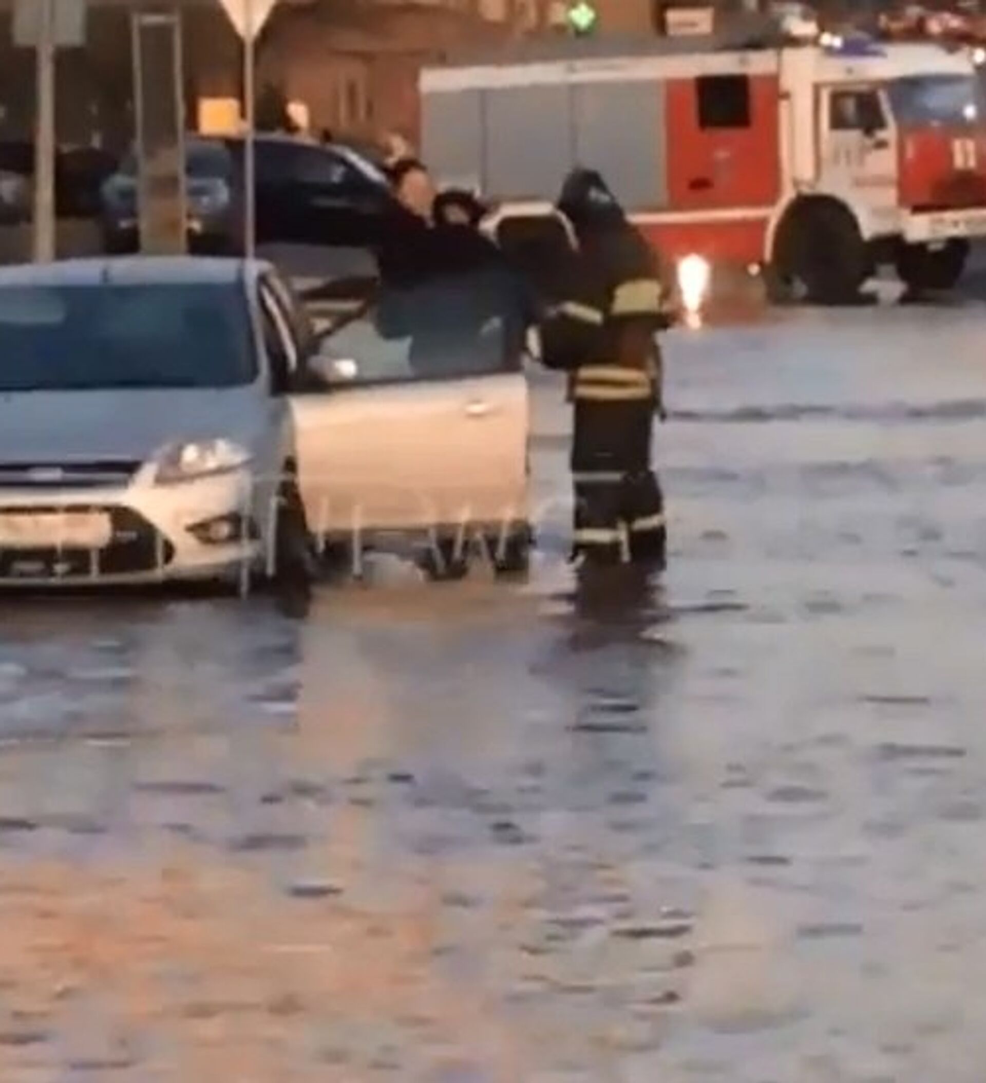 冷水淹沒了克雷姆斯基瓦爾街。緊急情況部工作人員向一名無法回到車里而站在路中間的女孩伸出援手。一名救援人員將她抱起,送到車旁,另一名救援人員同時將車門打開。