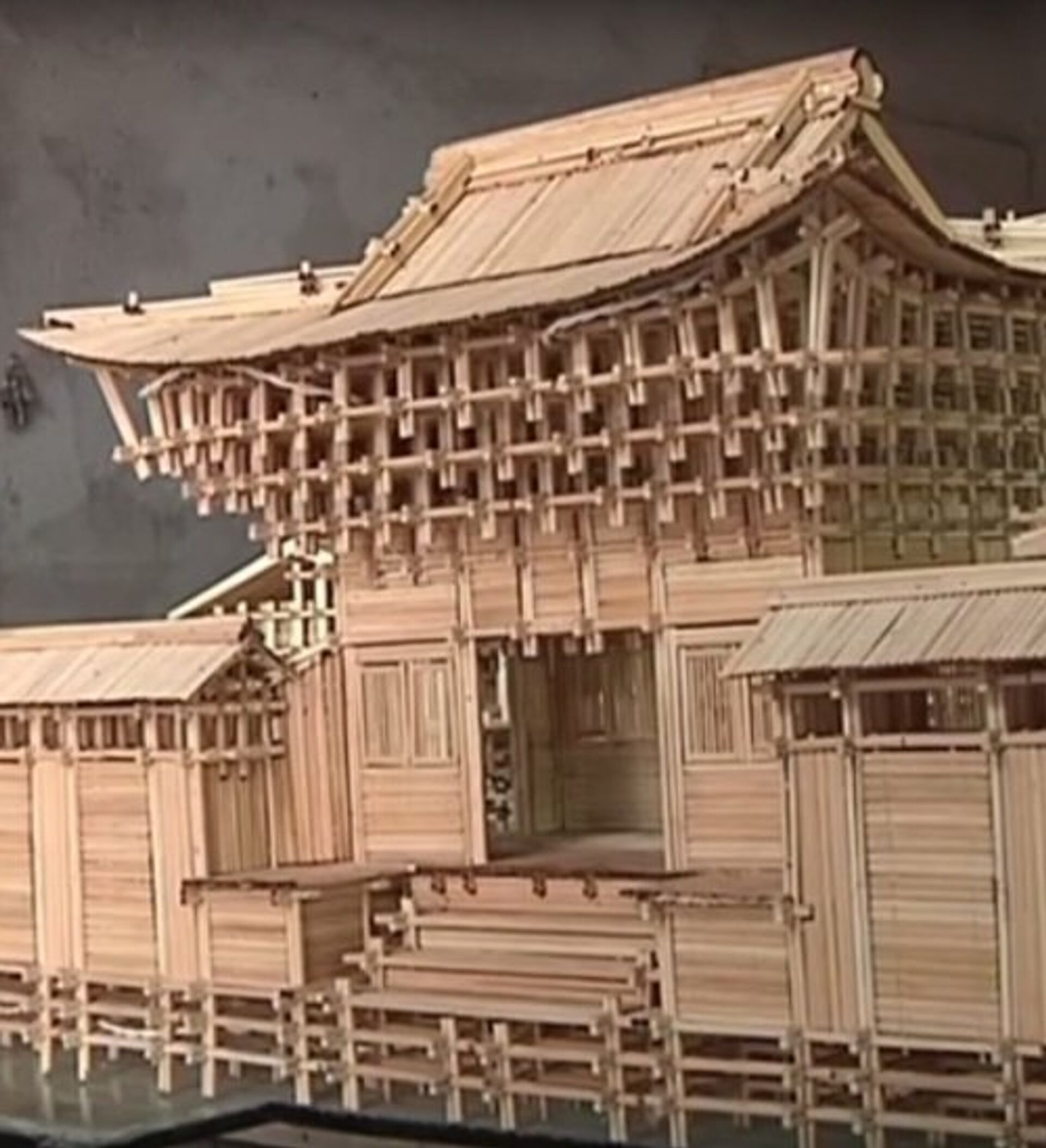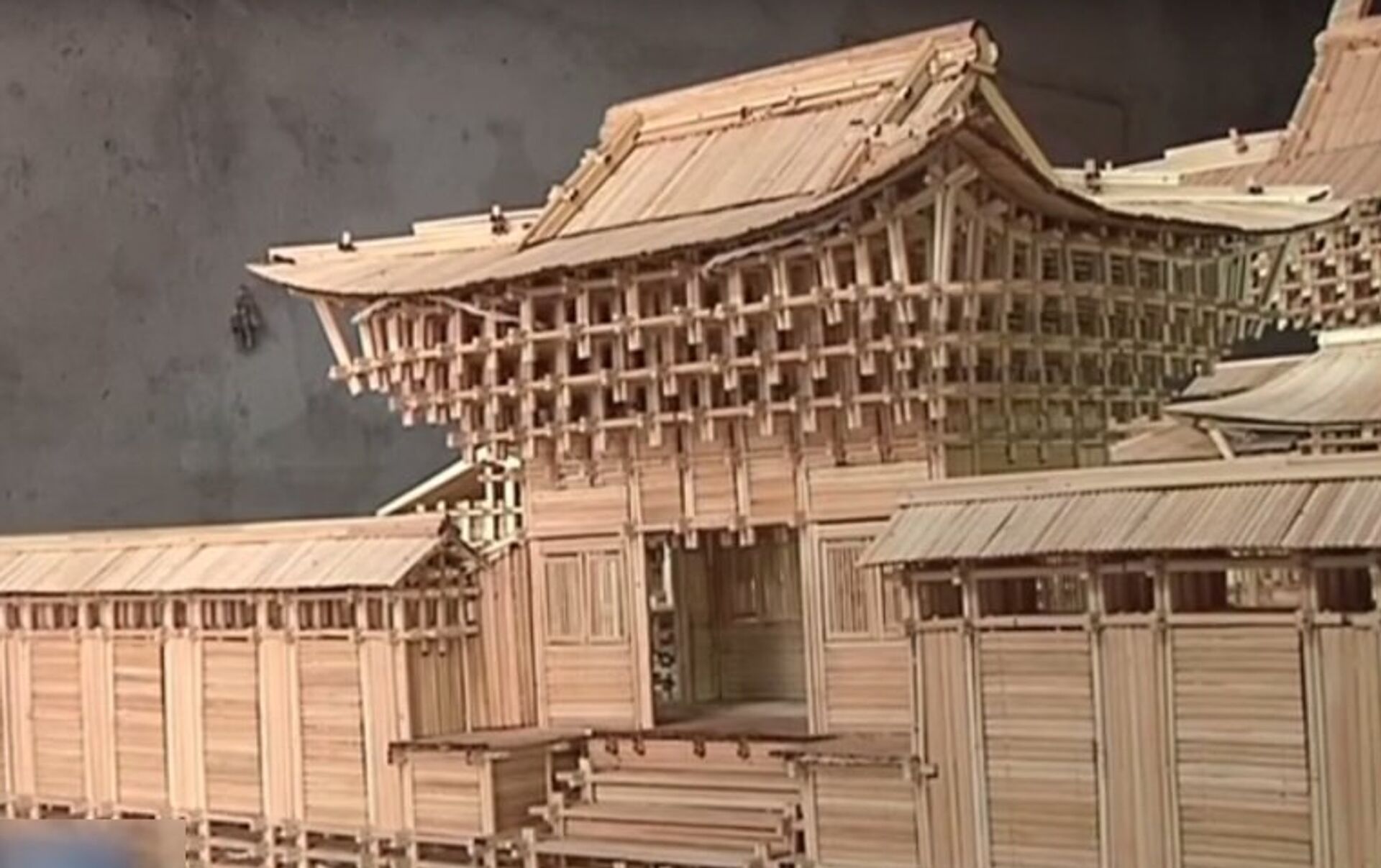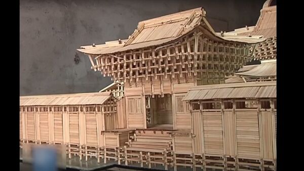 河北人張自明(音)用1.5萬雙一次性筷子製作出迷你古剎模型。 2016年11月24日, 俄羅斯衛星通訊社