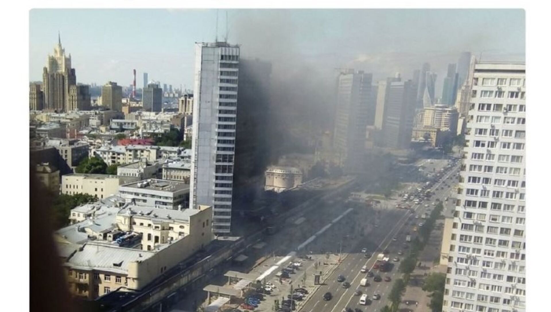 莫斯科應急部門消息人士向俄新社表示,新阿爾巴特大街一棟高層建築起火,20支消防隊開赴火災現場。 2017年7月18日, 俄羅斯衛星通訊社