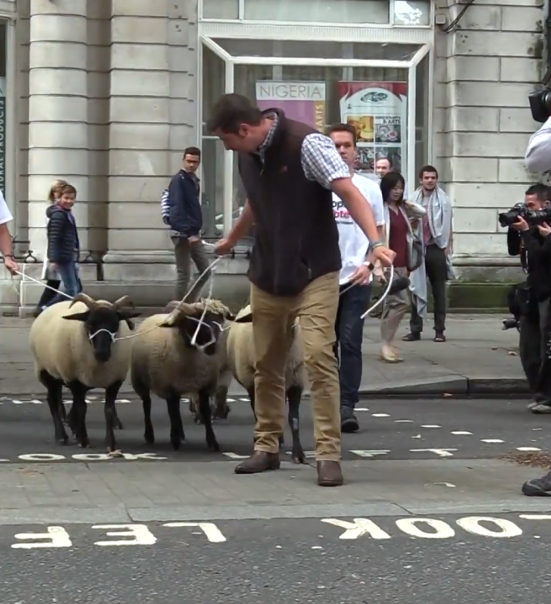 英國民間組織“人民投票”的抗議者週四將一群羊趕到了倫敦市中心,在英國國際貿易部坐落在白廳的辦公室附近進行示威。