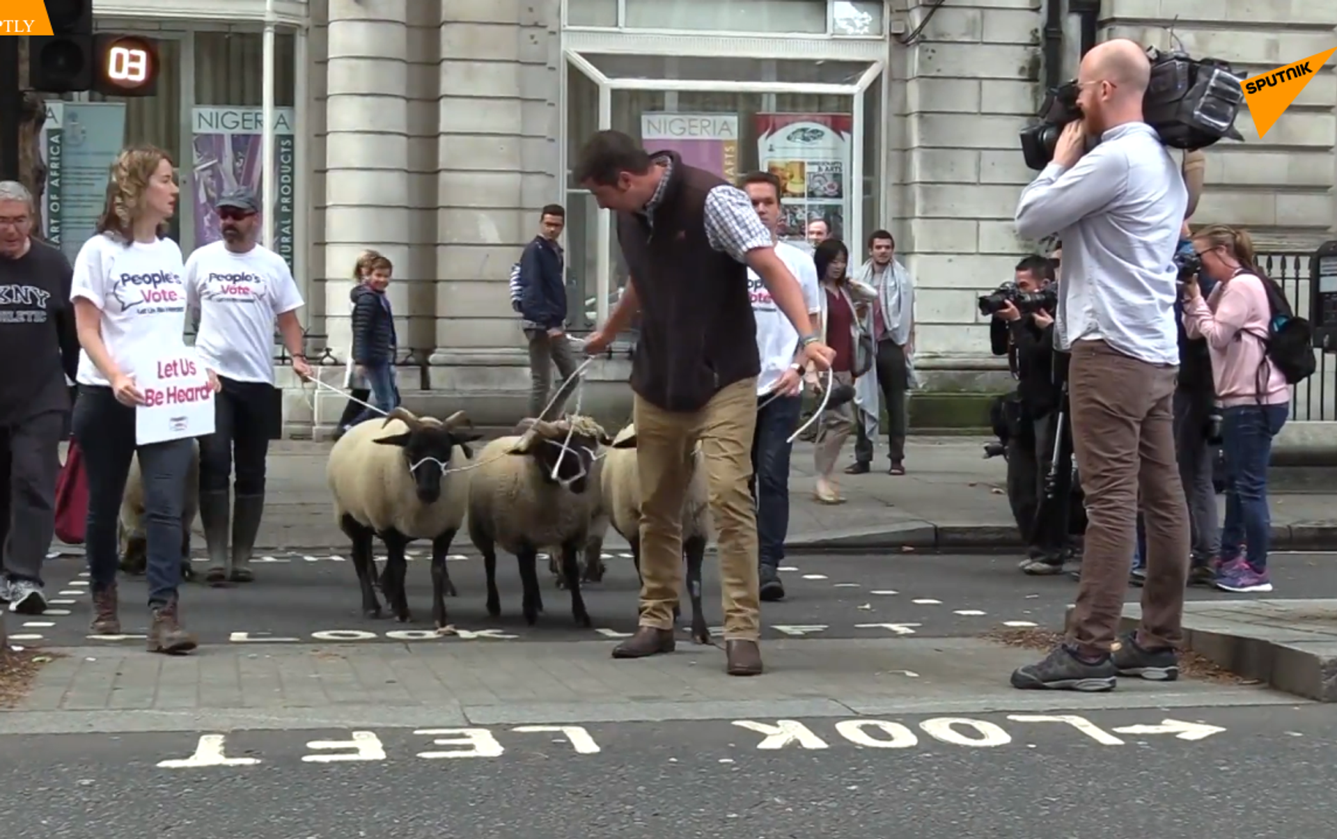 英國民間組織“人民投票”的抗議者週四將一群羊趕到了倫敦市中心,在英國國際貿易部坐落在白廳的辦公室附近進行示威。 2019年8月16日, 俄羅斯衛星通訊社