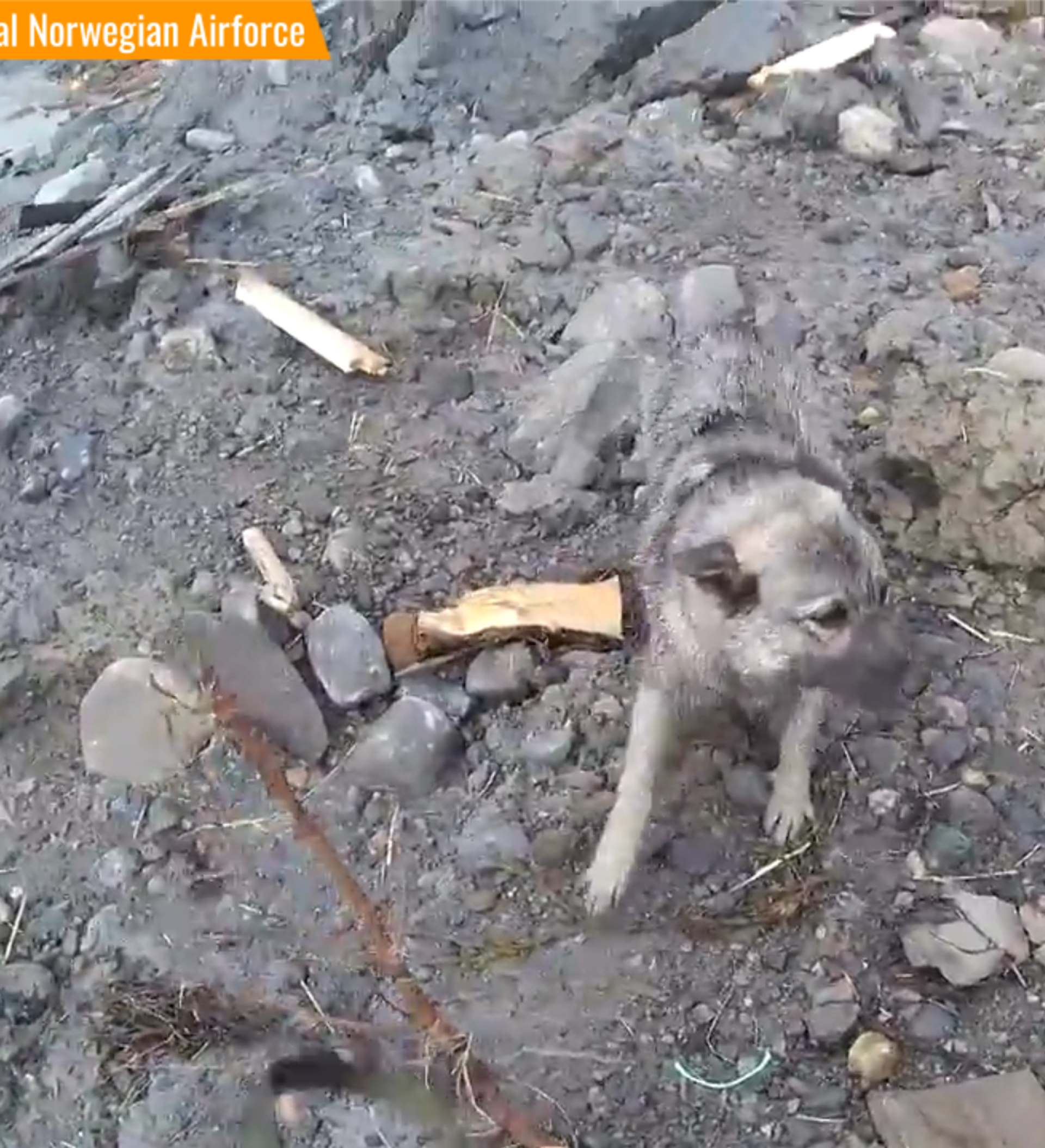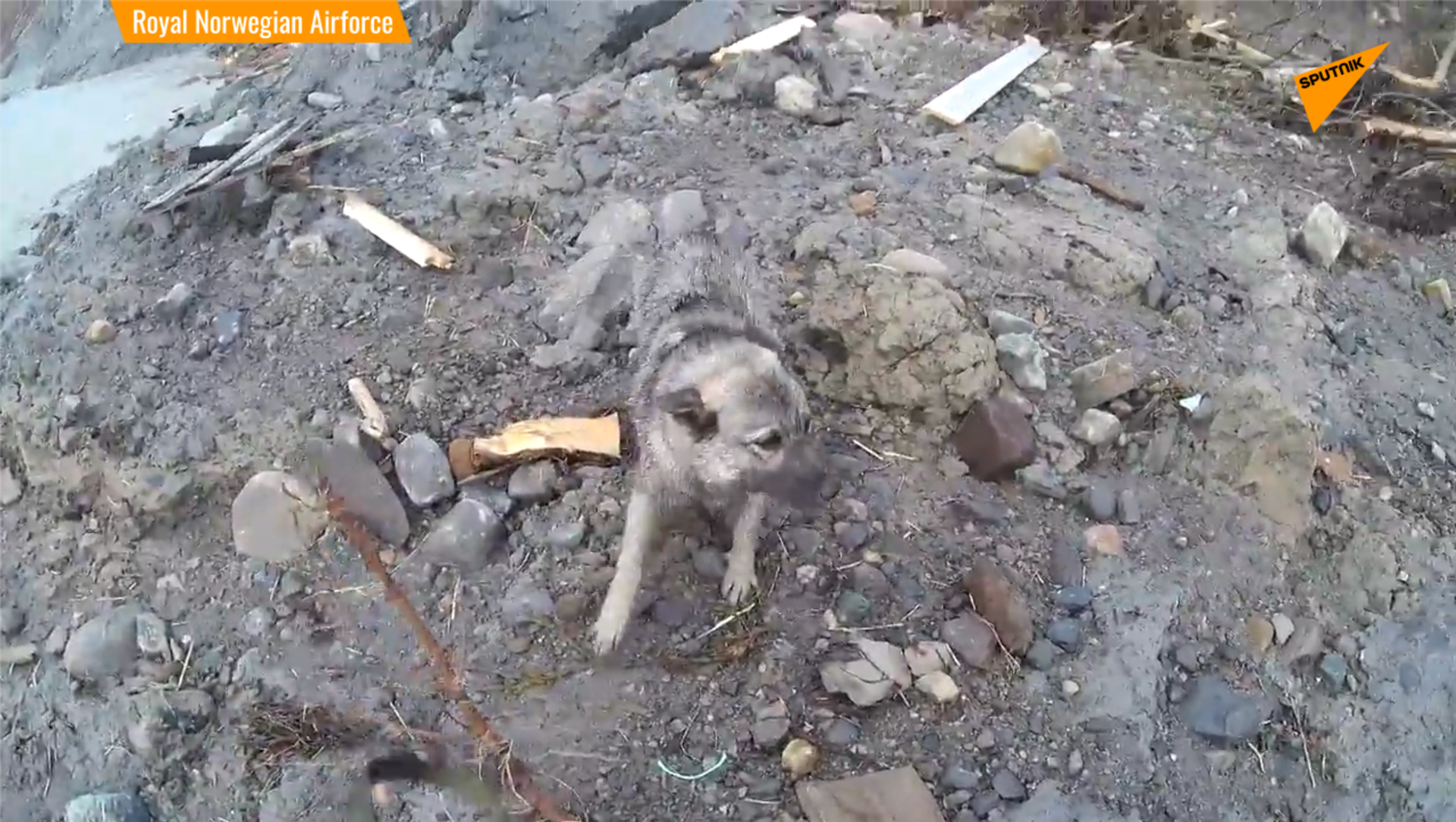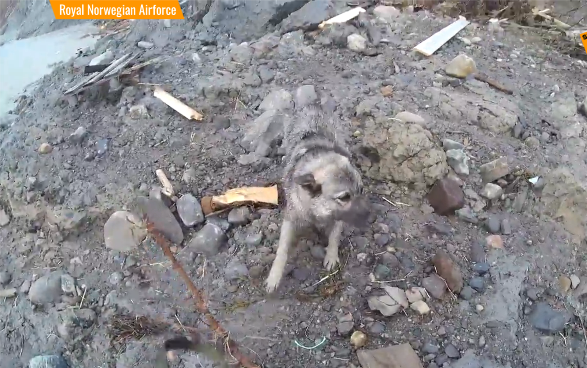 救援人員乘坐直升機環繞廢墟時,發現這只狗,當時周圍沒有人。營救順利完成撤離到安全地帶後,這只狗選擇了再次逃走。