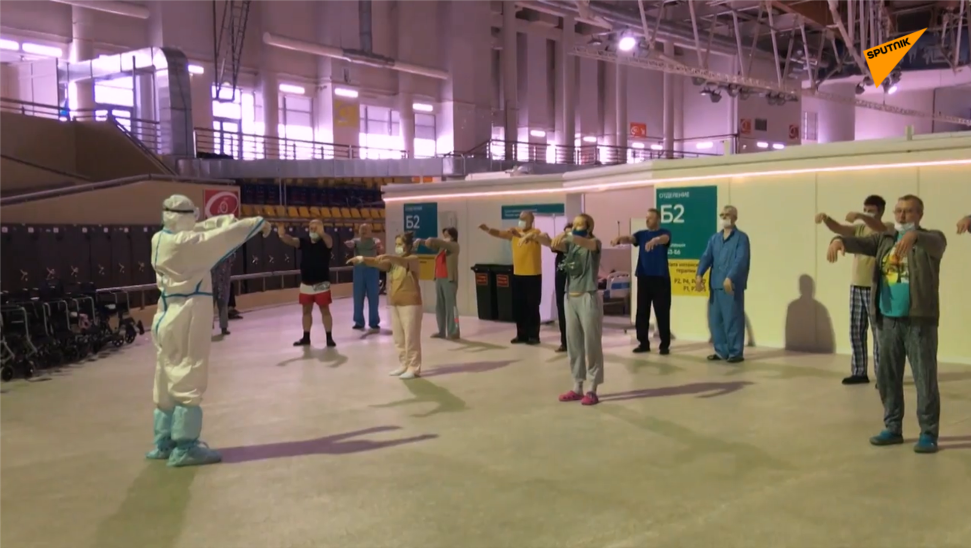 莫斯科市冰宮體育館方艙醫院醫師正在組織新冠(COVID-19)患者進行中國太極拳康復訓練。