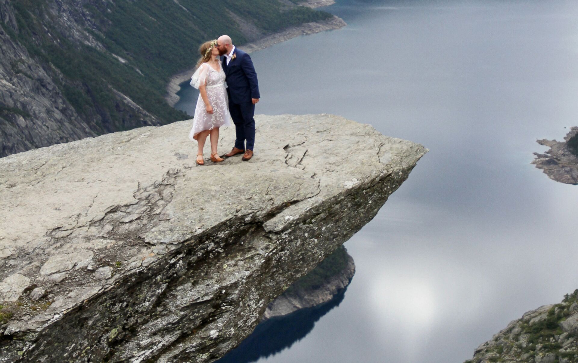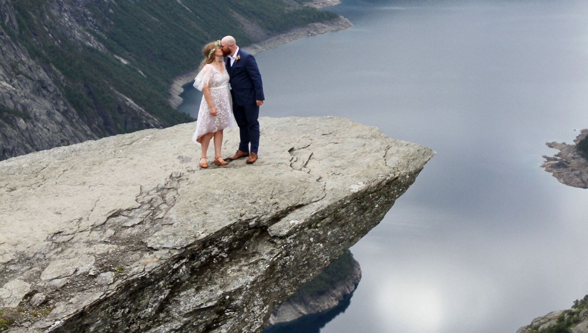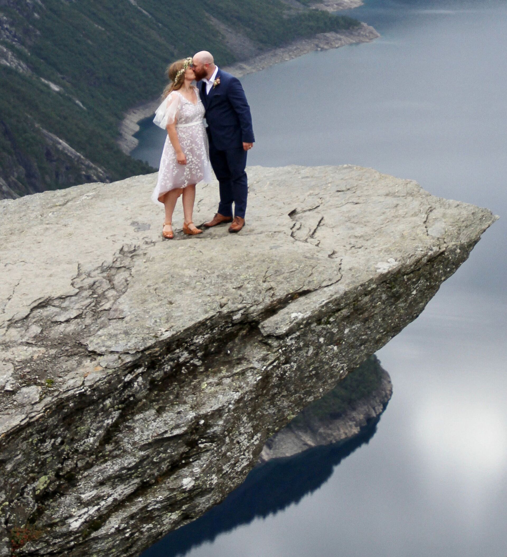 挪威“惡魔之舌”上的新婚夫婦。