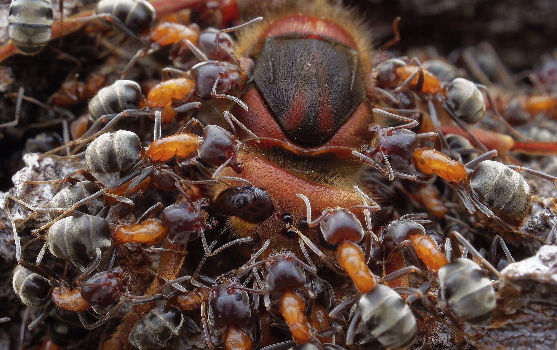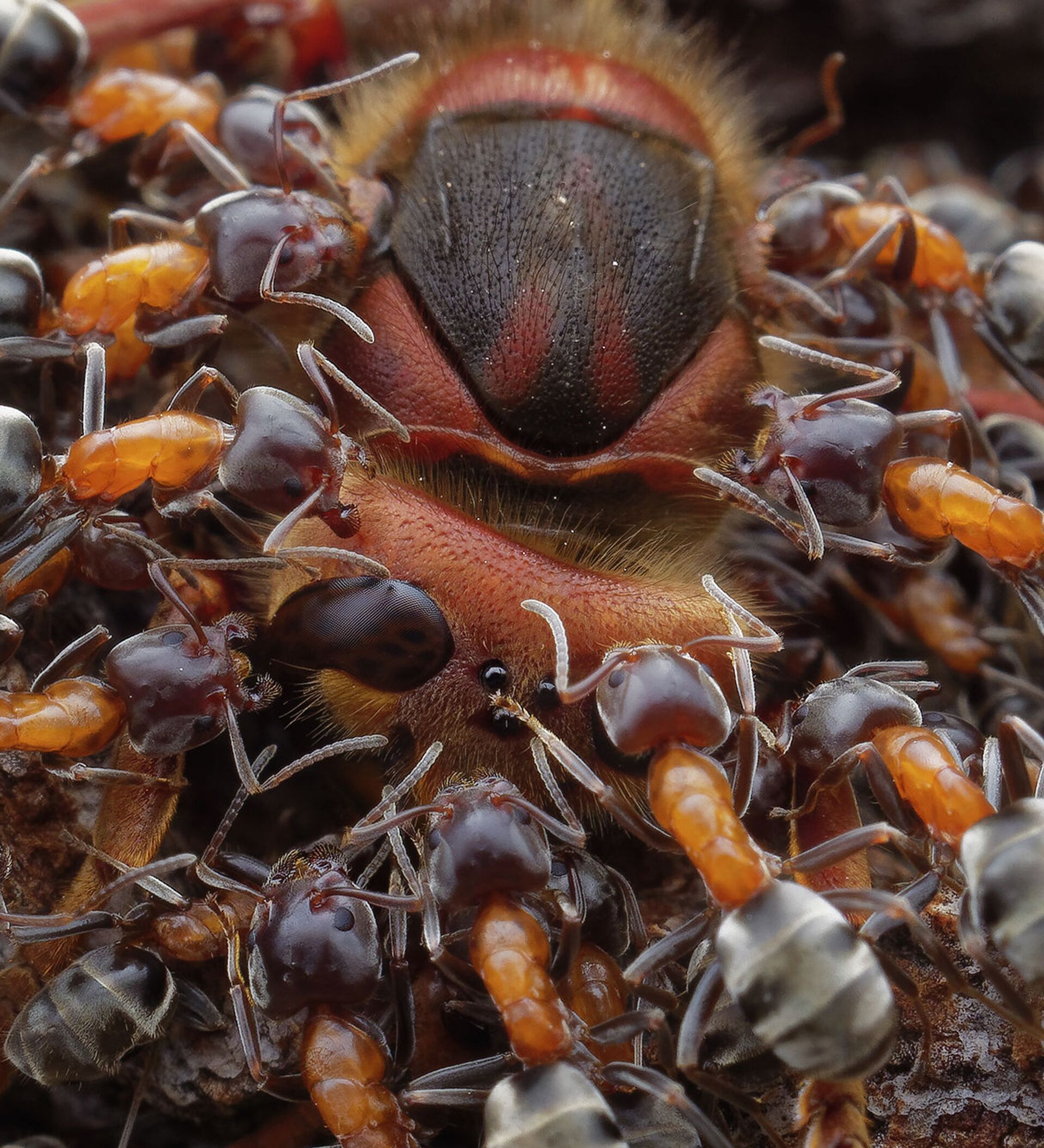 捷克攝影師Petr Bambousek(彼得•班布塞克)拍攝作品《Ants and Hornet》(螞蟻與大黃蜂)獲得2021年度特寫攝影師大賽 “昆蟲”單元類獎項第二名。 - 俄羅斯衛星通訊社