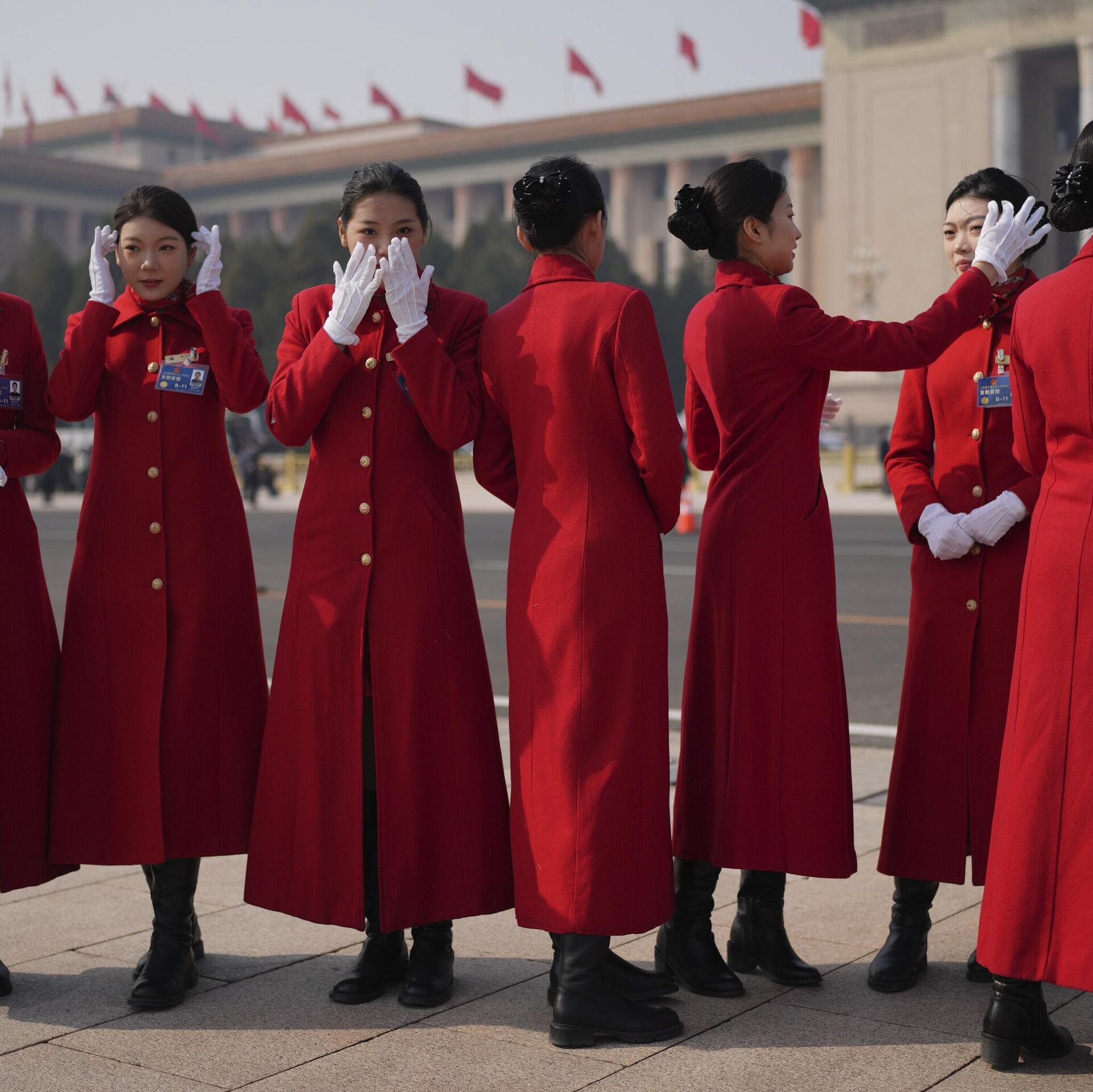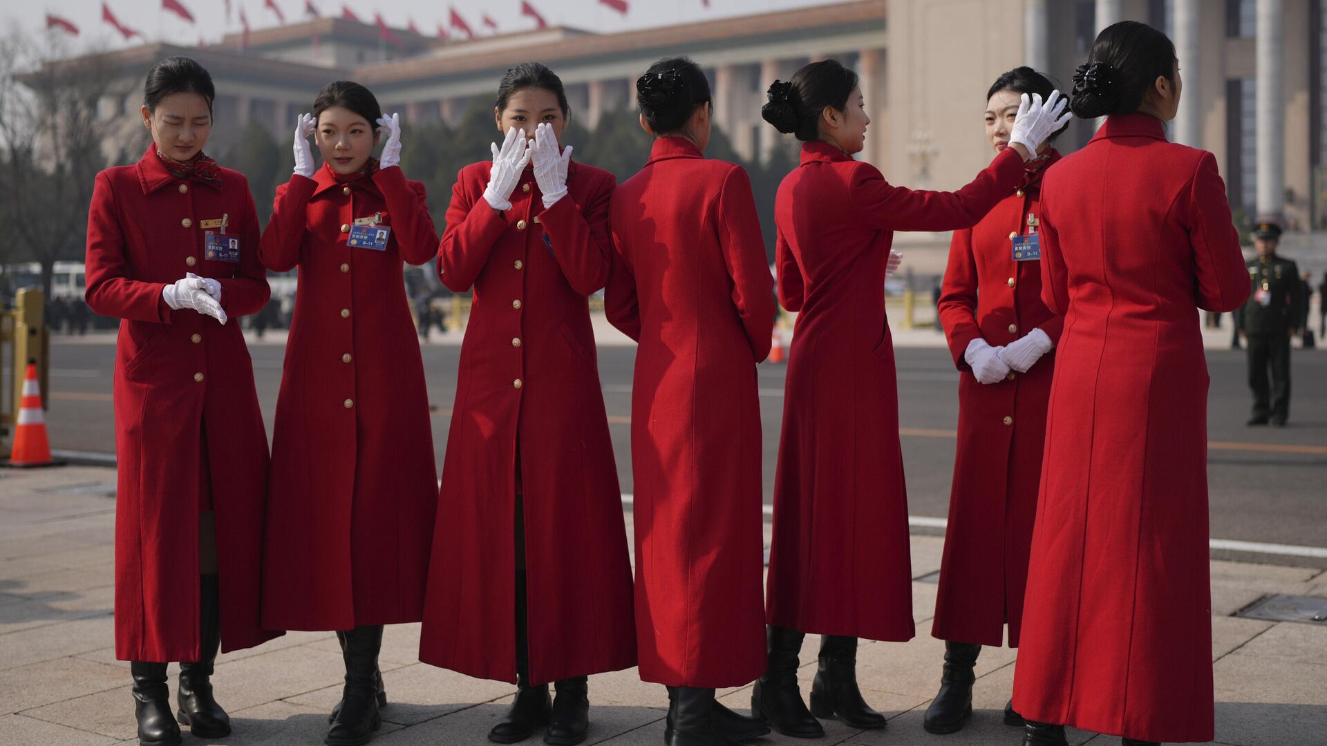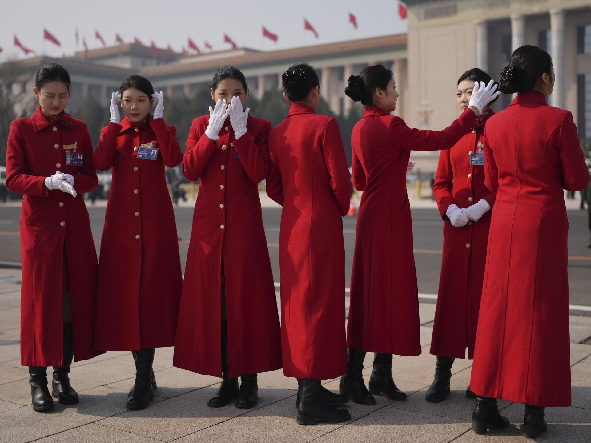 3月4日,中國全國人民代表大會開幕前夕,兩會大巴女乘務員在人民大會堂外拍照,整理頭髮。