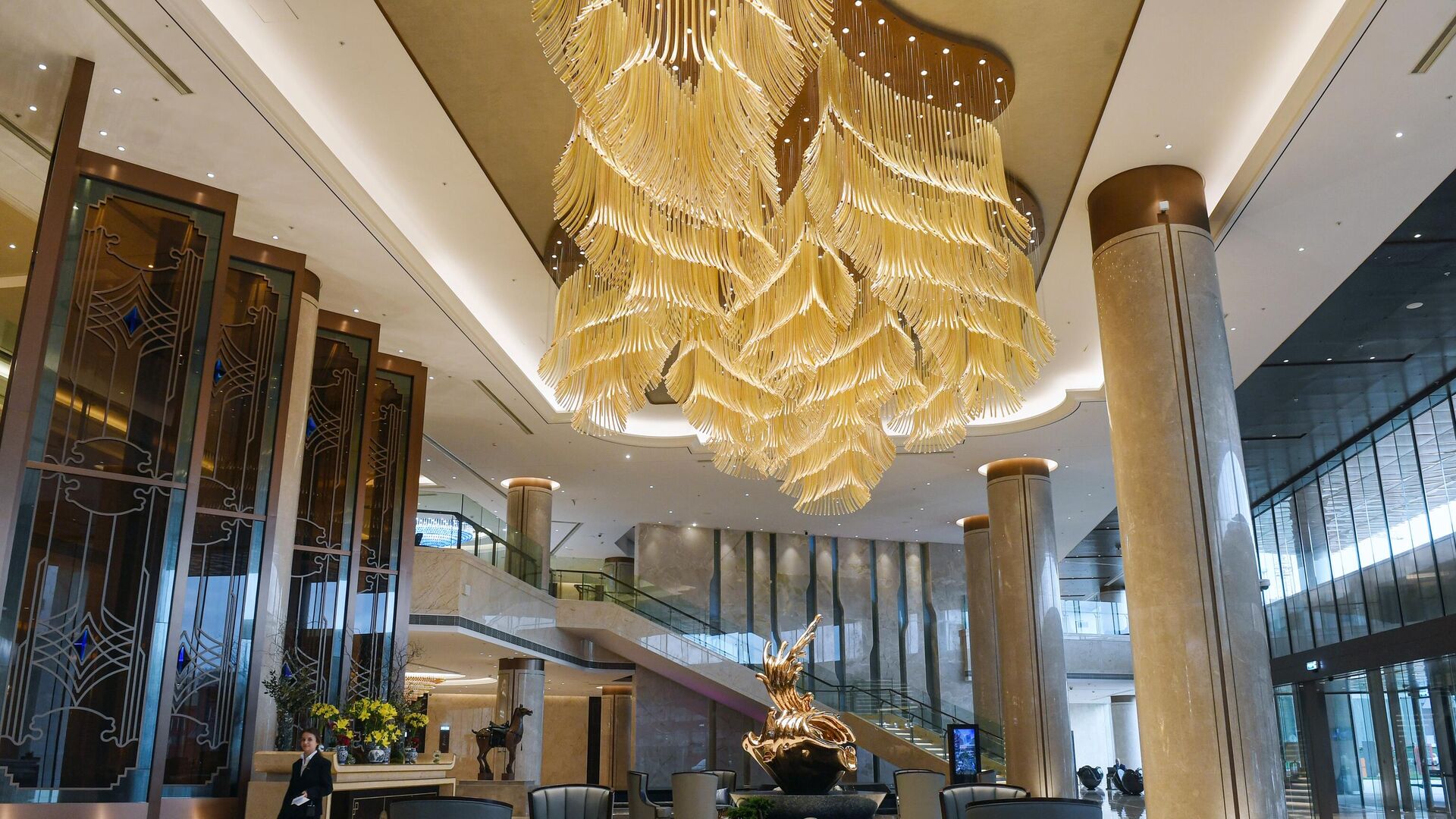 莫斯科陽光酒店大堂。作為中國商業中心“華銘園”的一部分,中國品牌“陽光”經營的高級酒店於2022年9月30日在莫斯科開業。