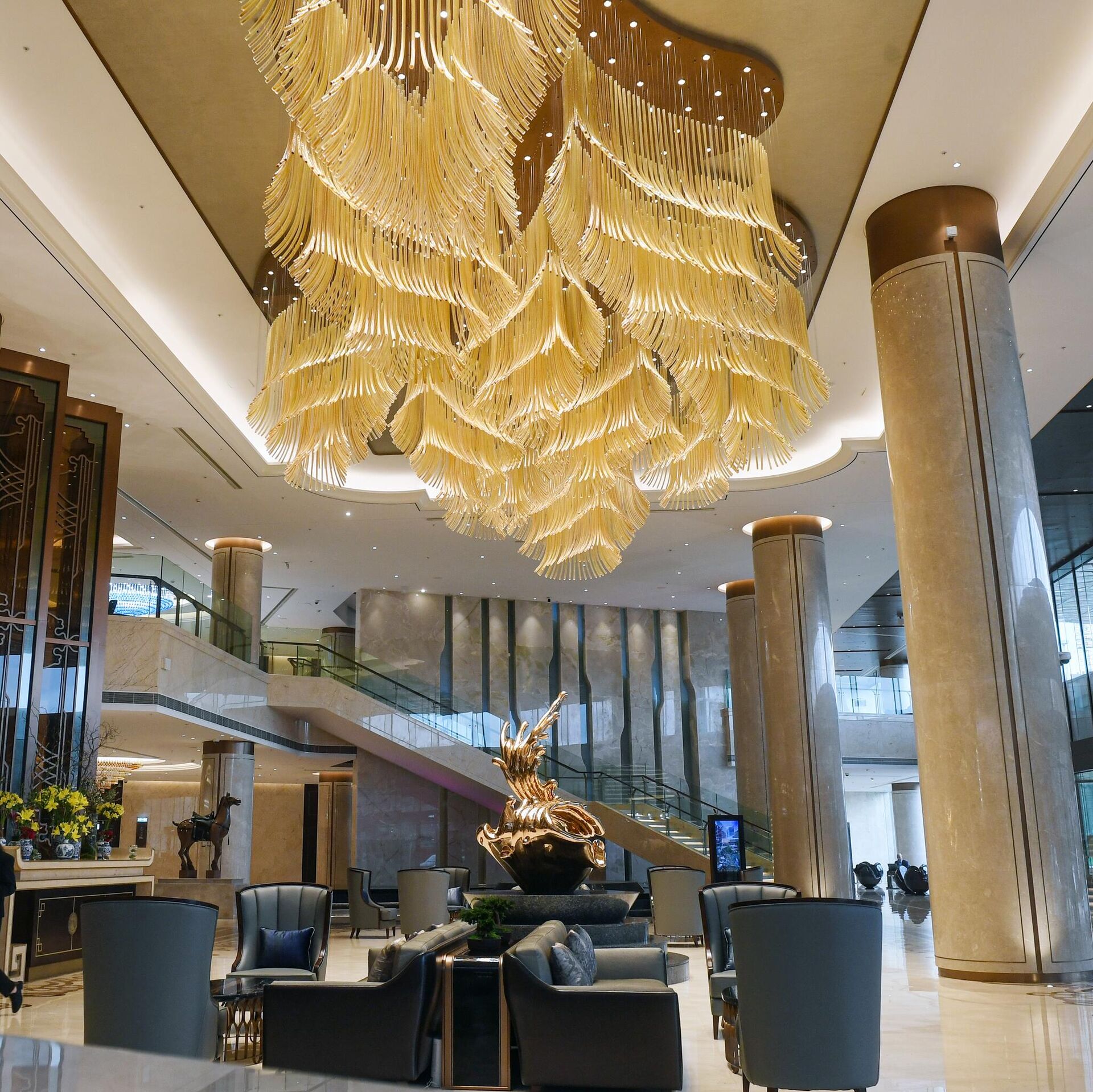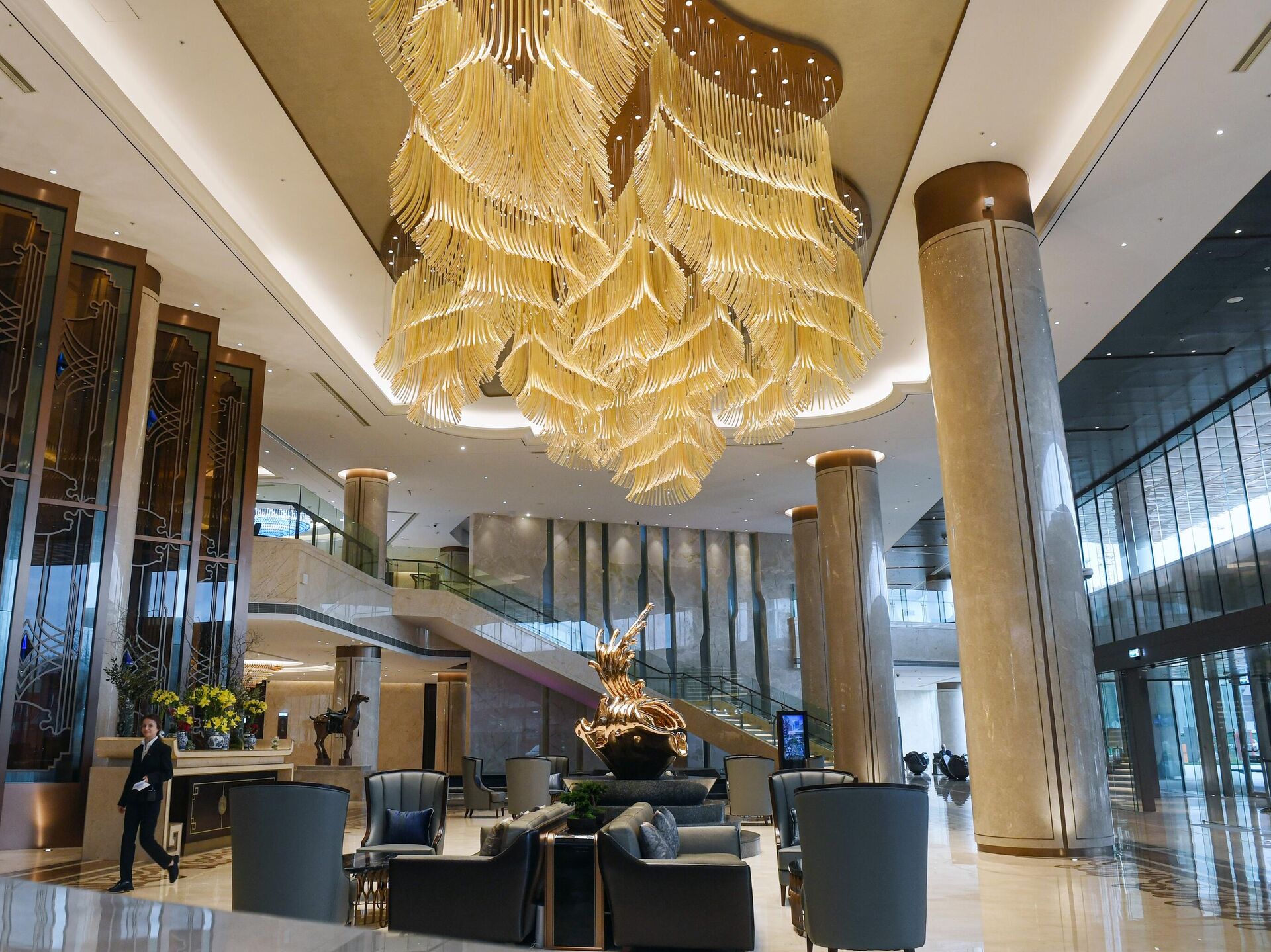 莫斯科陽光酒店大堂的一座雕塑馬。作為中國商業中心“華銘園”的一部分,中國品牌“陽光”經營的高級酒店於2022年9月30日在莫斯科開業。