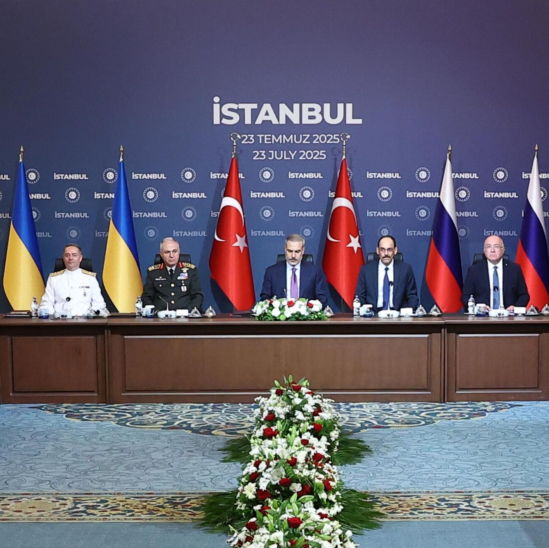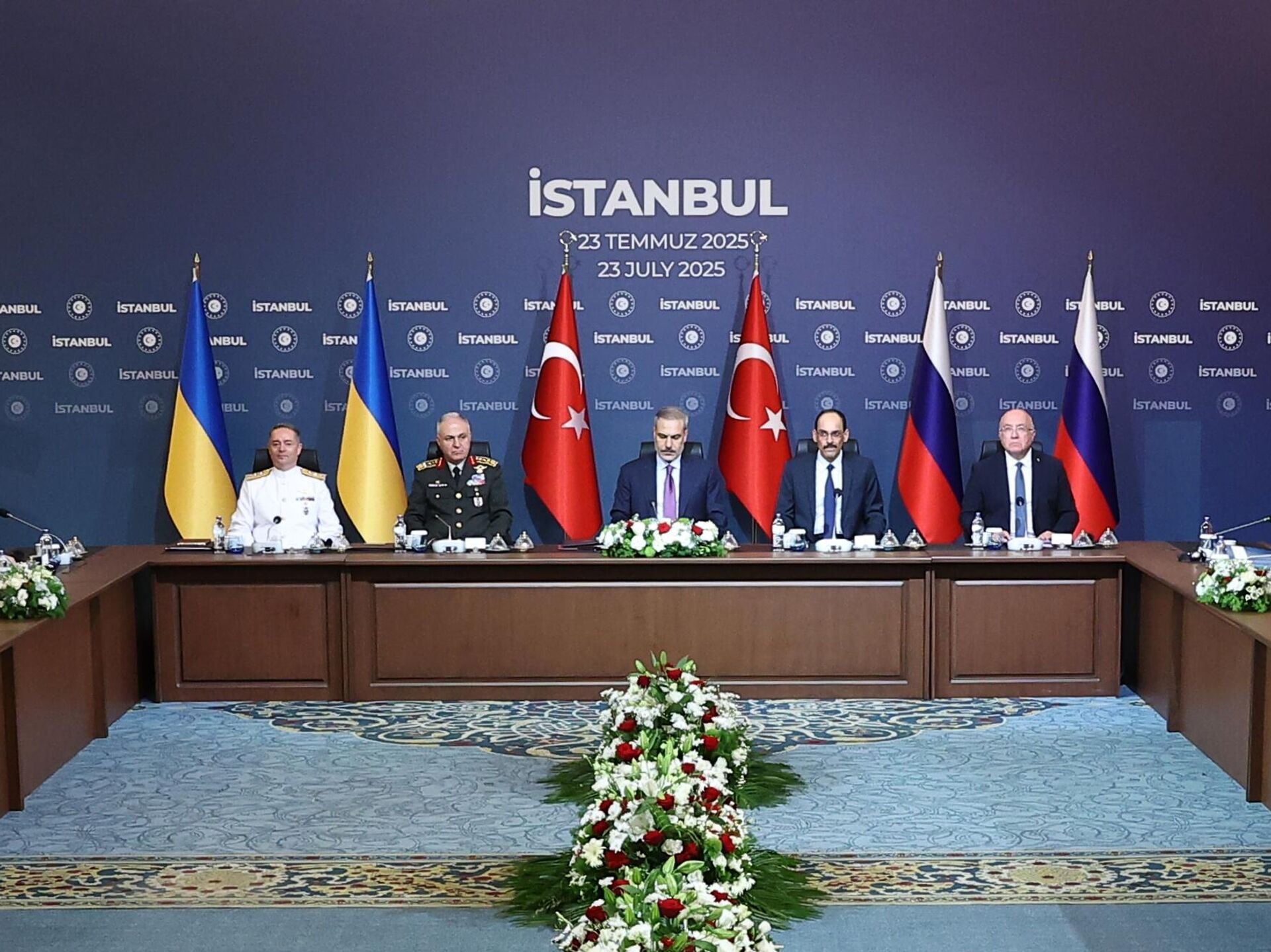 俄烏代表團第三輪談判7月23日在伊斯坦布爾的契拉昂宮舉行,談判持續近一小時。俄方代表團由總統助理梅金斯基率領,成員包括俄羅斯外交部副部長加盧津、俄軍總參謀部情報總局局長科斯秋科夫及國防部副部長福明。