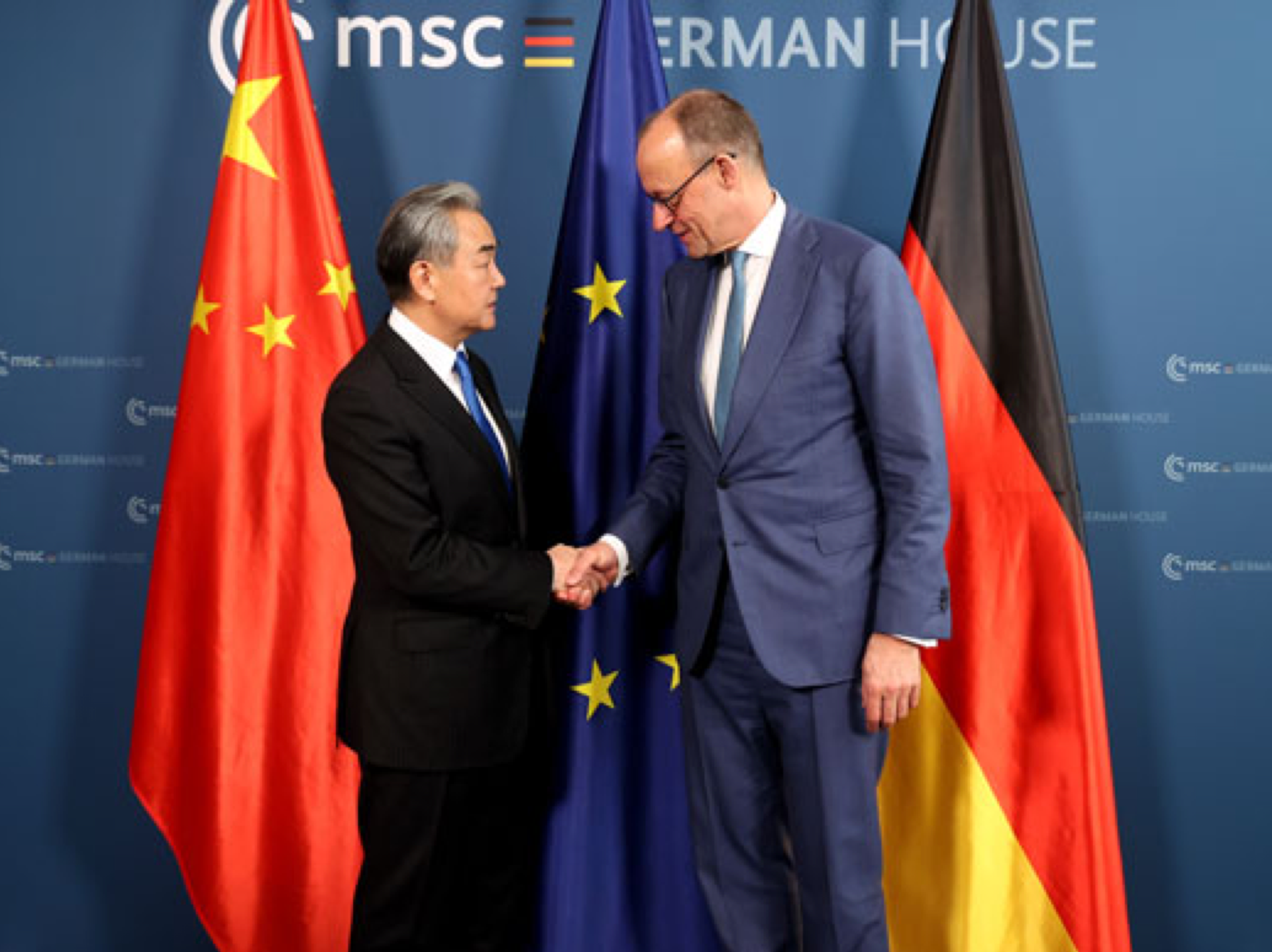 王毅首先轉達中國領導人對默茨的親切問候。王毅說,總理先生昨天在慕尼黑安全會議開幕式上的講話,體現了德國和歐洲期待戰略自主、自立自強。中方支持德國為此發揮更大作用。中國在國際舞台上提出的一切倡議,採取的一切行動,都是為維護以聯合國為核心的國際體系。儘管聯合國的權威和地位受到削弱,但其重要地位仍不可替代。習近平主席提出全球治理倡議,就是為了重振聯合國,構建更加公正合理的全球治理體系。在此大背景下,中德應展現大國擔當,為促進世界和平與發展作出新的貢獻,也期待德國成為中歐務實合作的推進器、